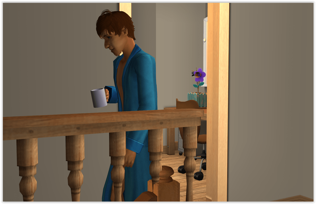 Early next morning, Timothy finds an empty cup on his desk (why, Christy? There’s so much counter space in the kitchen! Sims are silly!).